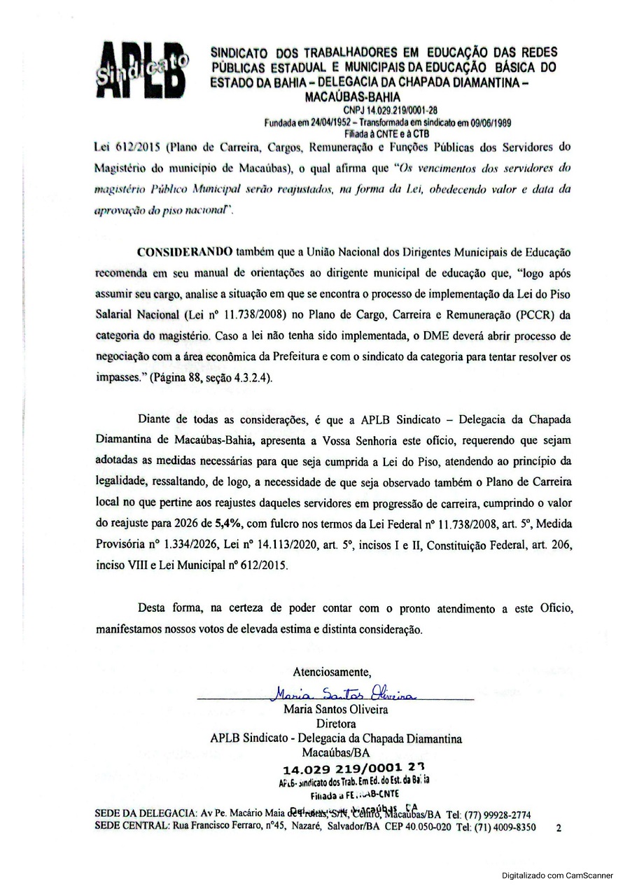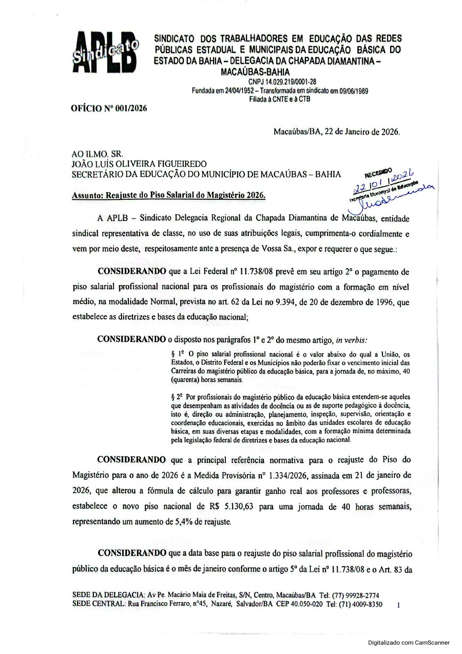Cumprindo com a agenda de atividades 2026, a APLB Sindicato Delegacia da Chapada Diamantina de Macaúbas protocolou Ofício na data de hoje, 22/01/2026, requerendo o reajuste do Piso Salarial do Magistério de 5,4%, com validade a partir de 1º de janeiro de 2026, elevando o salário base do Magistério para R$ 5.130,63 para a jornada de 40 horas semanais.